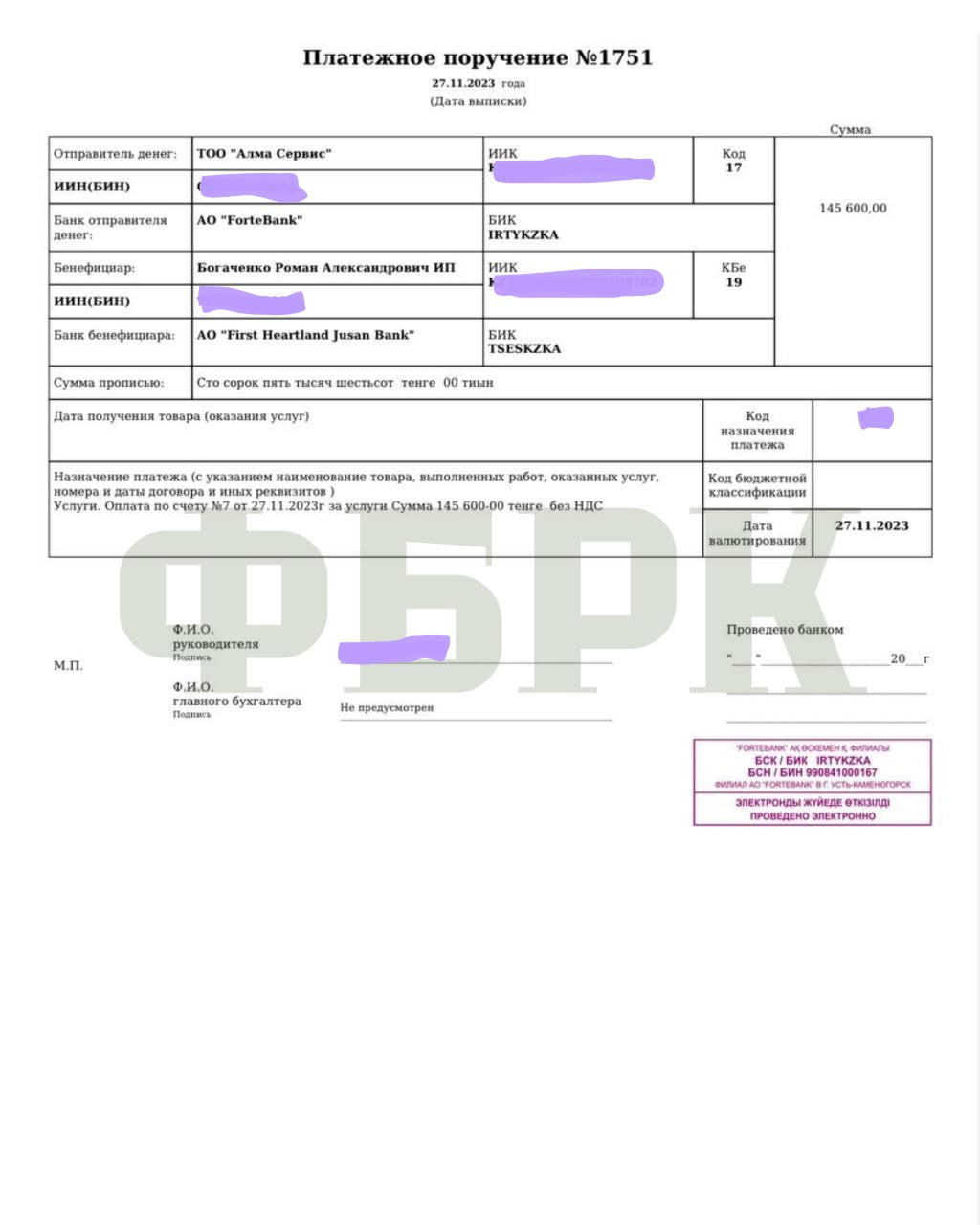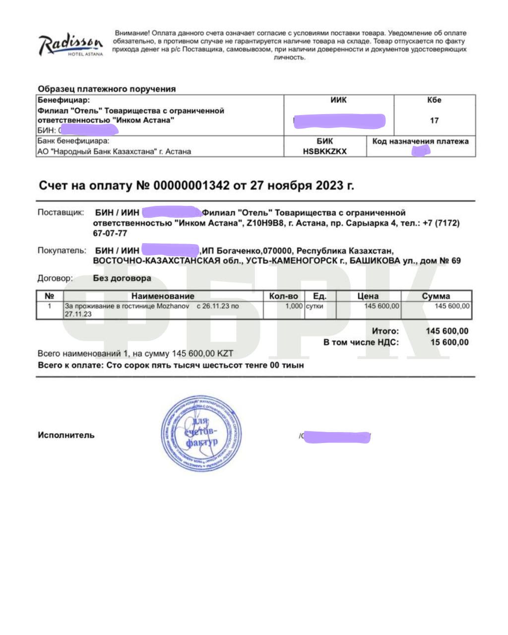 Согласно акту выполненных работ от 1 декабря 2023 года, Ever Rest Group взялся организовать проживание Можанова на три дня по 100 тыс. тенге в сутки. Итого за три дня — 300 тыс. тенге. Агентство, занимающееся туристической деятельностью, выставило счет ИП Богаченко на эту же сумму.