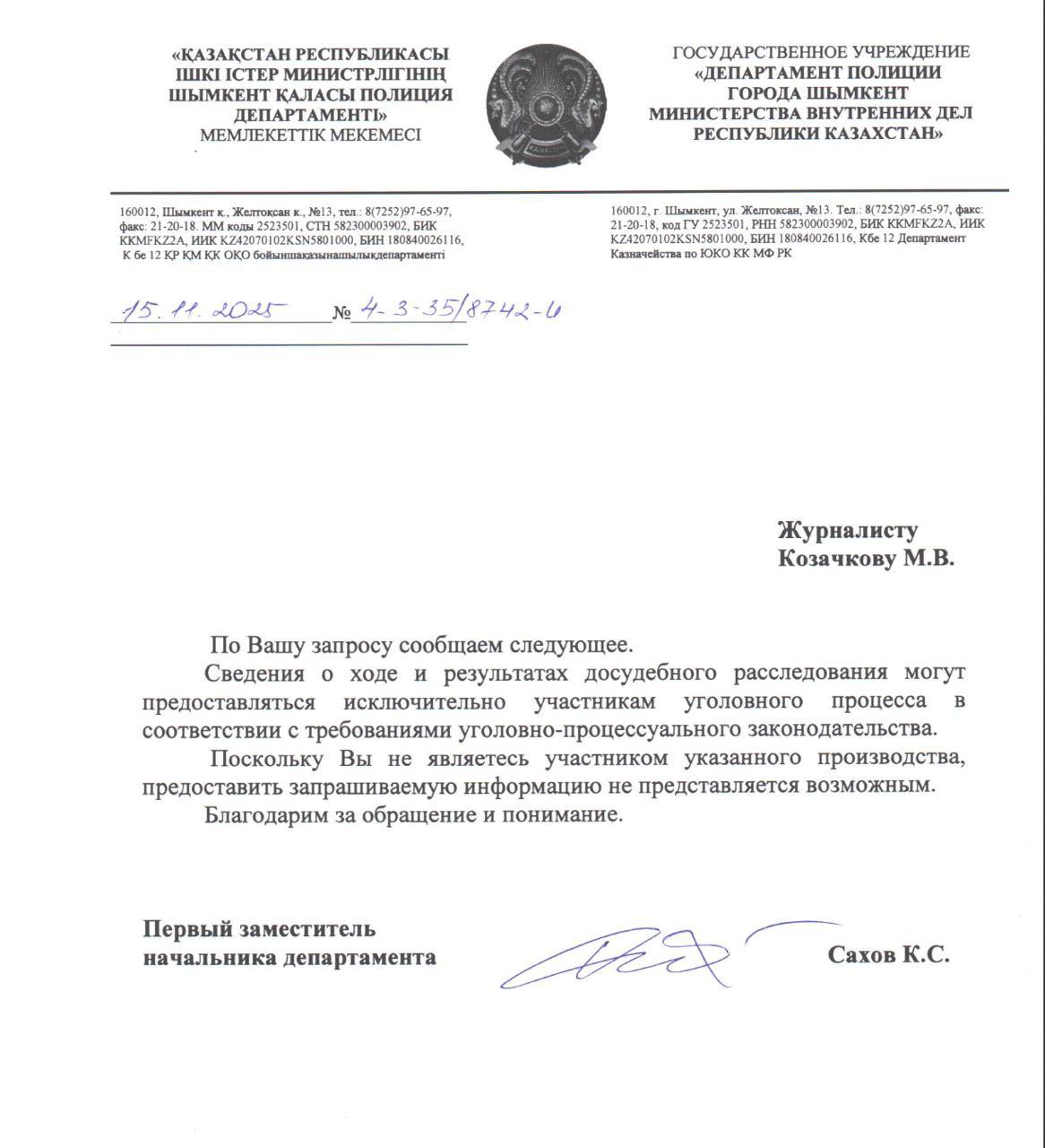 Журналист Михаил Козачков получил информацию о расследовании в отношении блогера Айгуль Орынбек через неофициальные источники — департамент полиции Шымкента отказался раскрывать сведения.