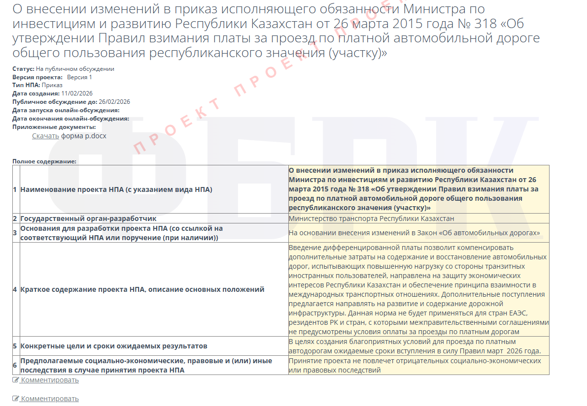 Министерство транспорта Республики Казахстан инициировало обсуждение поправок в приказ о внедрении дифференцированного подхода к оплате проезда по платным участкам автодорог республиканского значения.