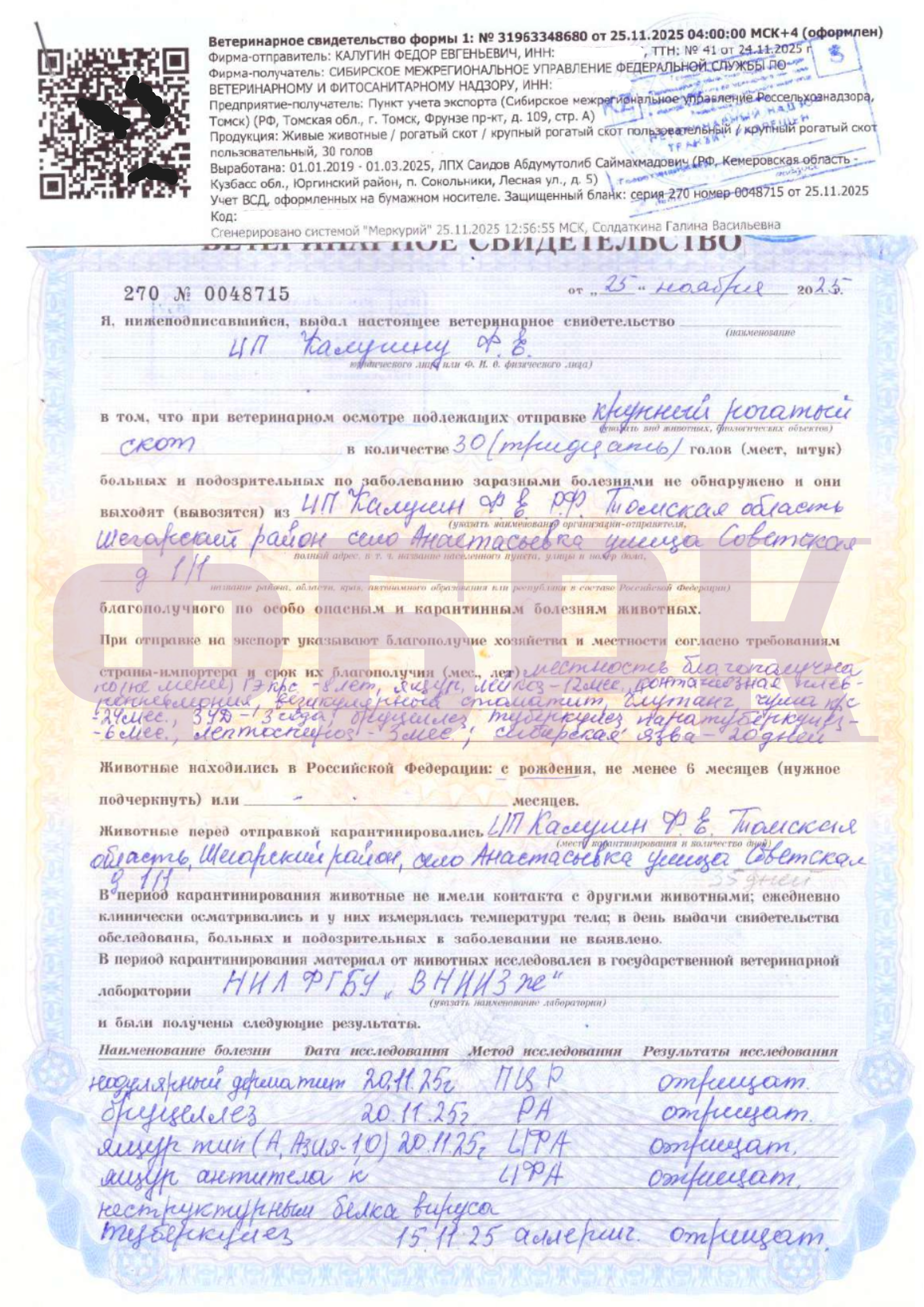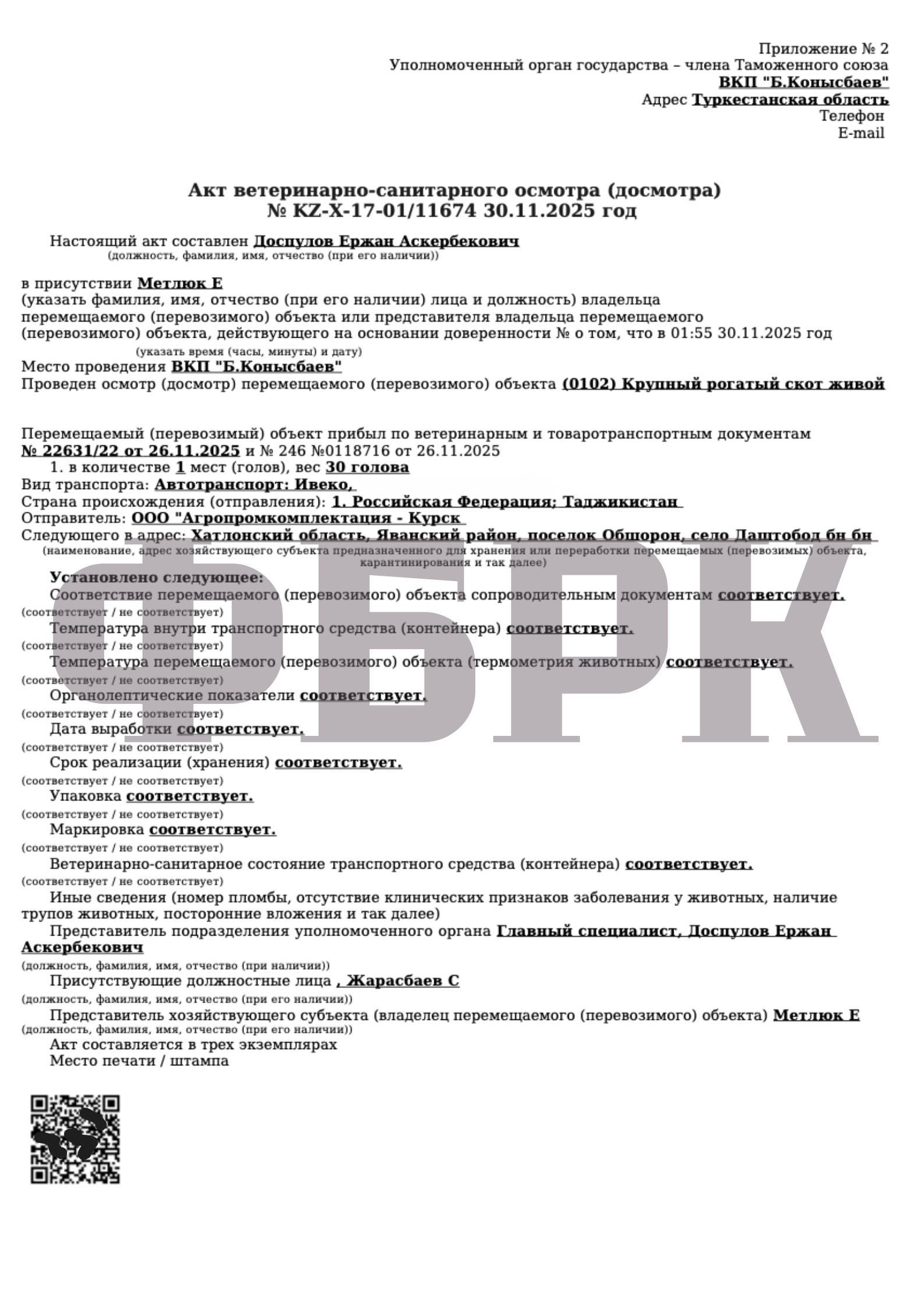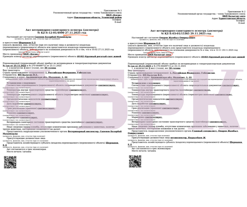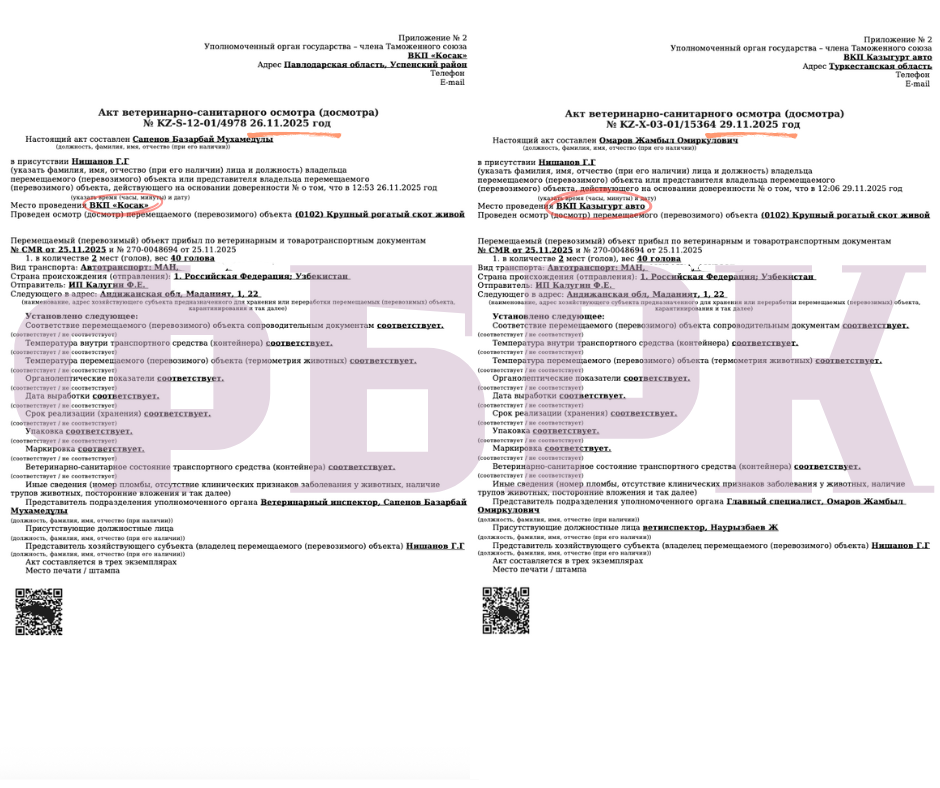 Ветеринарно-контрольный пункт (ВКП) «Казыгурт авто» Туркестанской области, например, фигурирует в актах осмотра к свидетельствам от 25 ноября. Первое сопровождается актами на ВКП «Косак» от 26 ноября, подписанным ветеринарным инспектором Базарбаем Сапеновым, и «Казыгурт авто» от 29 ноября, подписанным главным специалистом Жамбылом Омаровым.