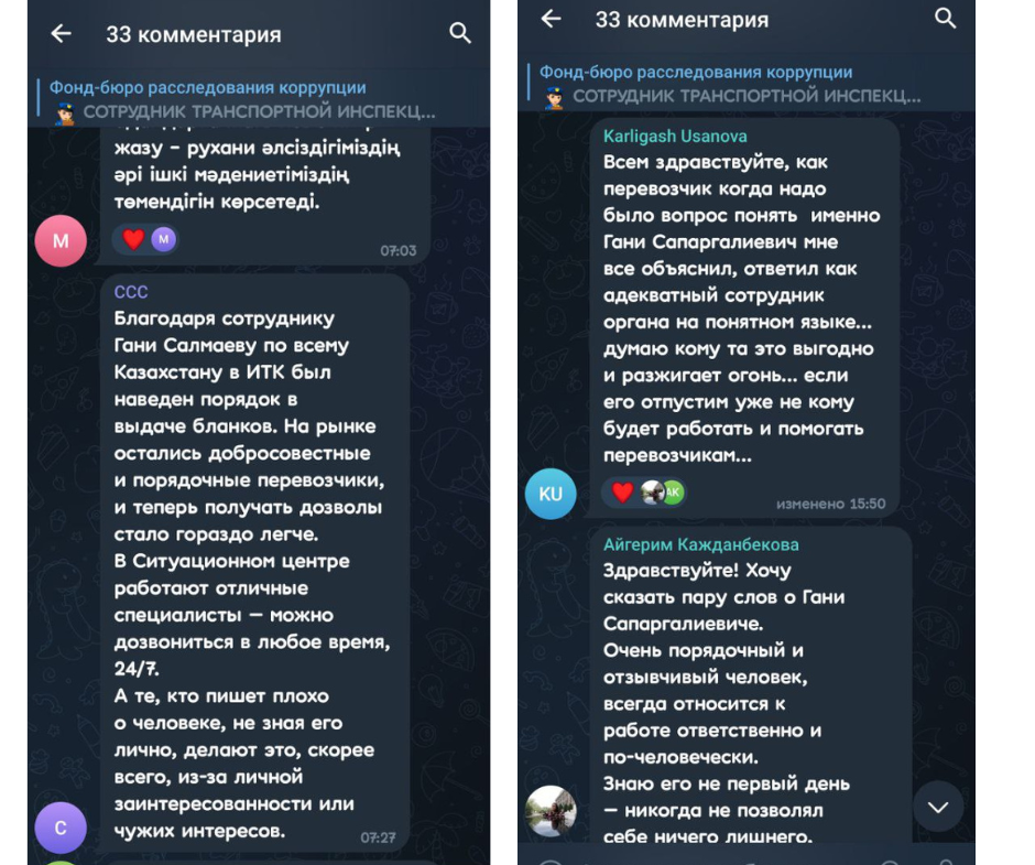 В комментариях появились десятки однотипных сообщений в защиту фигурантов, а в анонимный бот поступили материалы, призванные дискредитировать заявителя Нурсултана Булатбекова. Проверка данных выявила признаки возможной фабрикации, а настойчивость анонимного источника и его манипулятивные приемы подняли вопросы об организованной кампании.