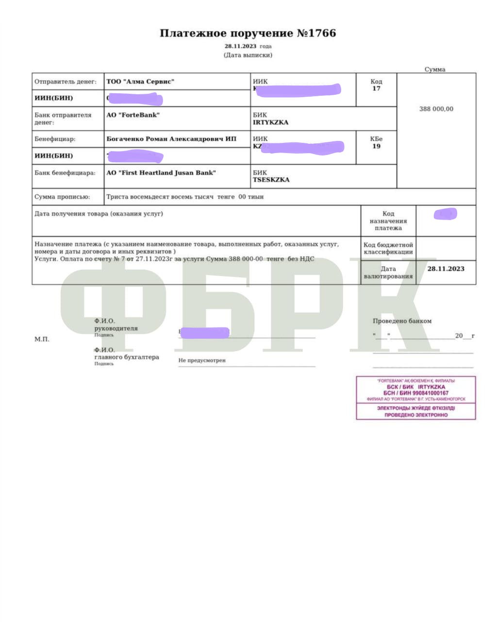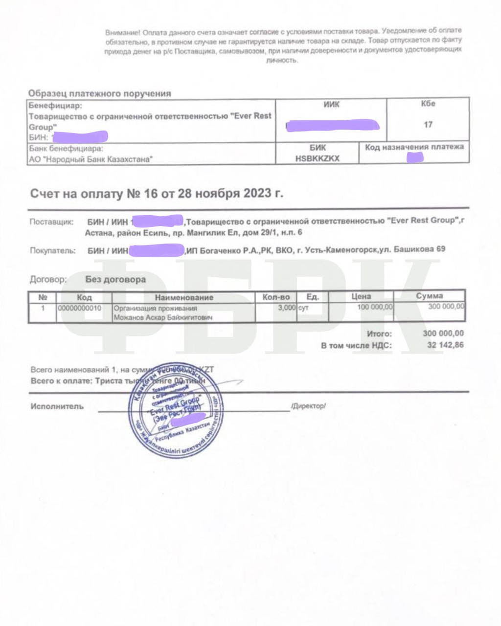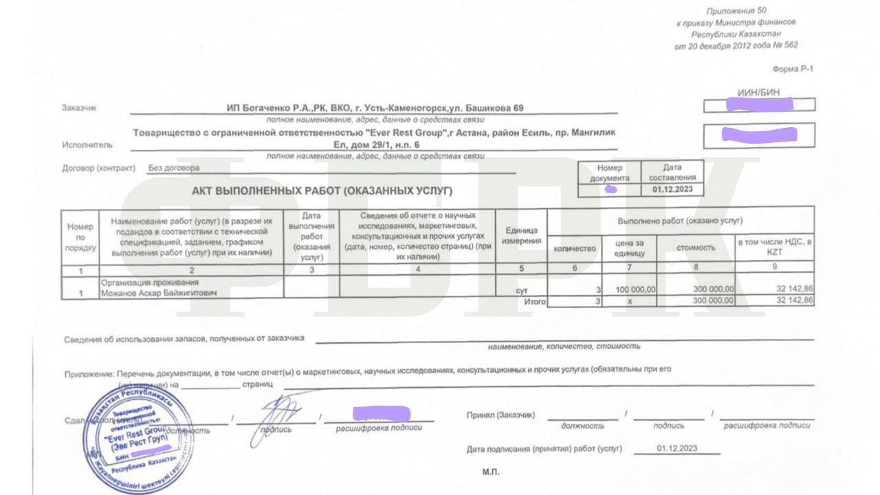 Согласно акту выполненных работ от 1 декабря 2023 года, Ever Rest Group взялся организовать проживание Можанова на три дня по 100 тыс. тенге в сутки. Итого за три дня — 300 тыс. тенге. Агентство, занимающееся туристической деятельностью, выставило счет ИП Богаченко на эту же сумму.