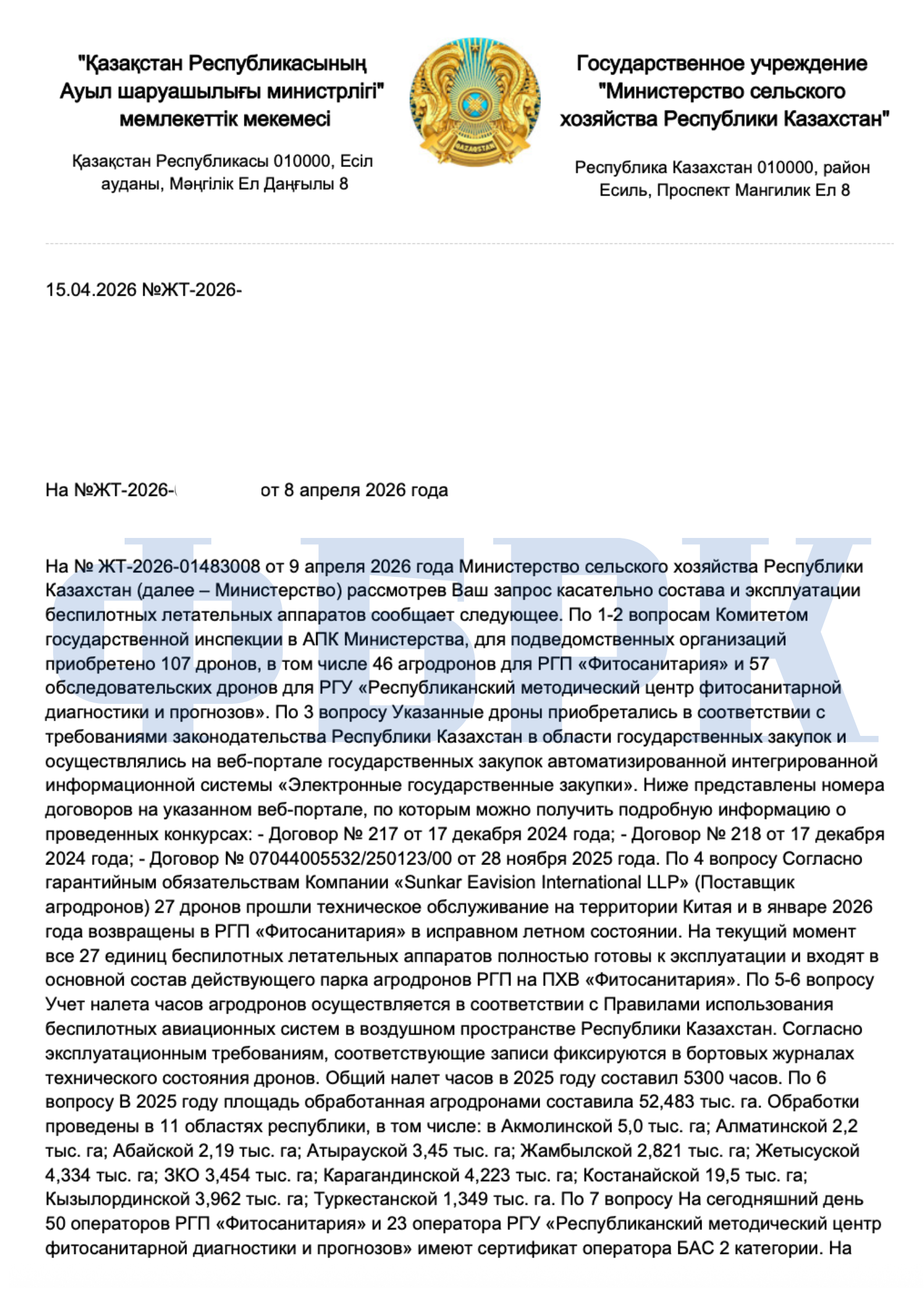 Полгода назад министерство сельского хозяйства (МСХ) не смогло ответить редакции ФБРК ни на вопрос о судьбе 27 сломанных дронов, ни о часах их налёта, ни о квалификации операторов. Тогда больше половины парка агродронов, закупленных за 368 млн тенге, находились на гарантийном ремонте в Китае. Весной 2026 года редакция направила повторный запрос. На этот раз ведомство ответило подробнее — и часть давних пробелов наконец закрыта.
