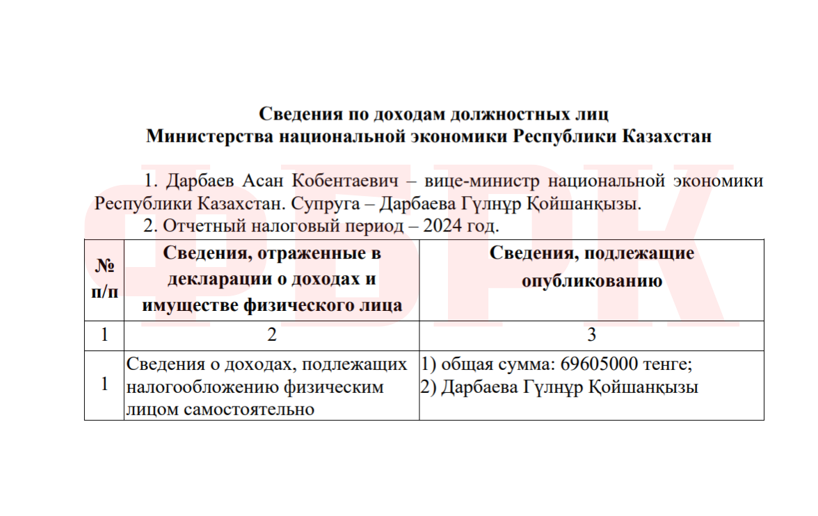 В тех же публикациях содержатся данные о доходах супруги вице-министра национальной экономики Асана Дарбаева. Его жена — Гульнур Дарбаева — задекларировала доход в размере 69 605 000 тенге за 2024 год.