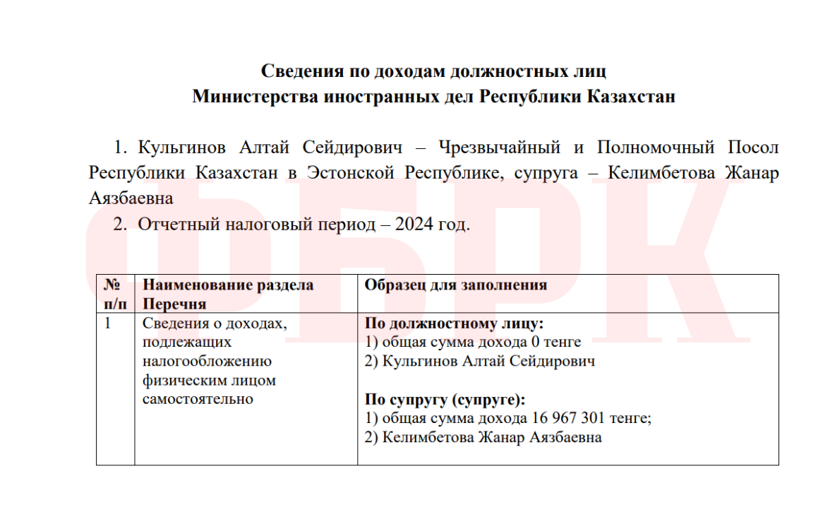 В министерстве иностранных дел доходы задекларированы только супругой должностного лица. Жена чрезвычайного и полномочного посла Казахстана в Эстонии Алтая Кулгинова —Жанар Келимбетова — указала доход в размере 16,97 млн тенге, при этом сам дипломат задекларировал нулевой доход за отчетный период.