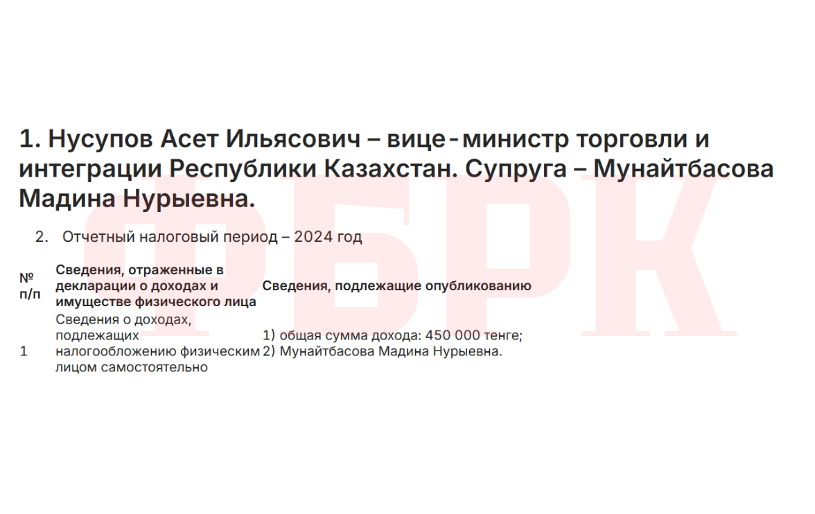 В министерстве торговли и интеграции доход супруги вице-министра Асета Нусупова —Мадины Мунайтбасовой — составил 450 тыс. тенге, что является одним из самых низких показателей среди опубликованных деклараций.