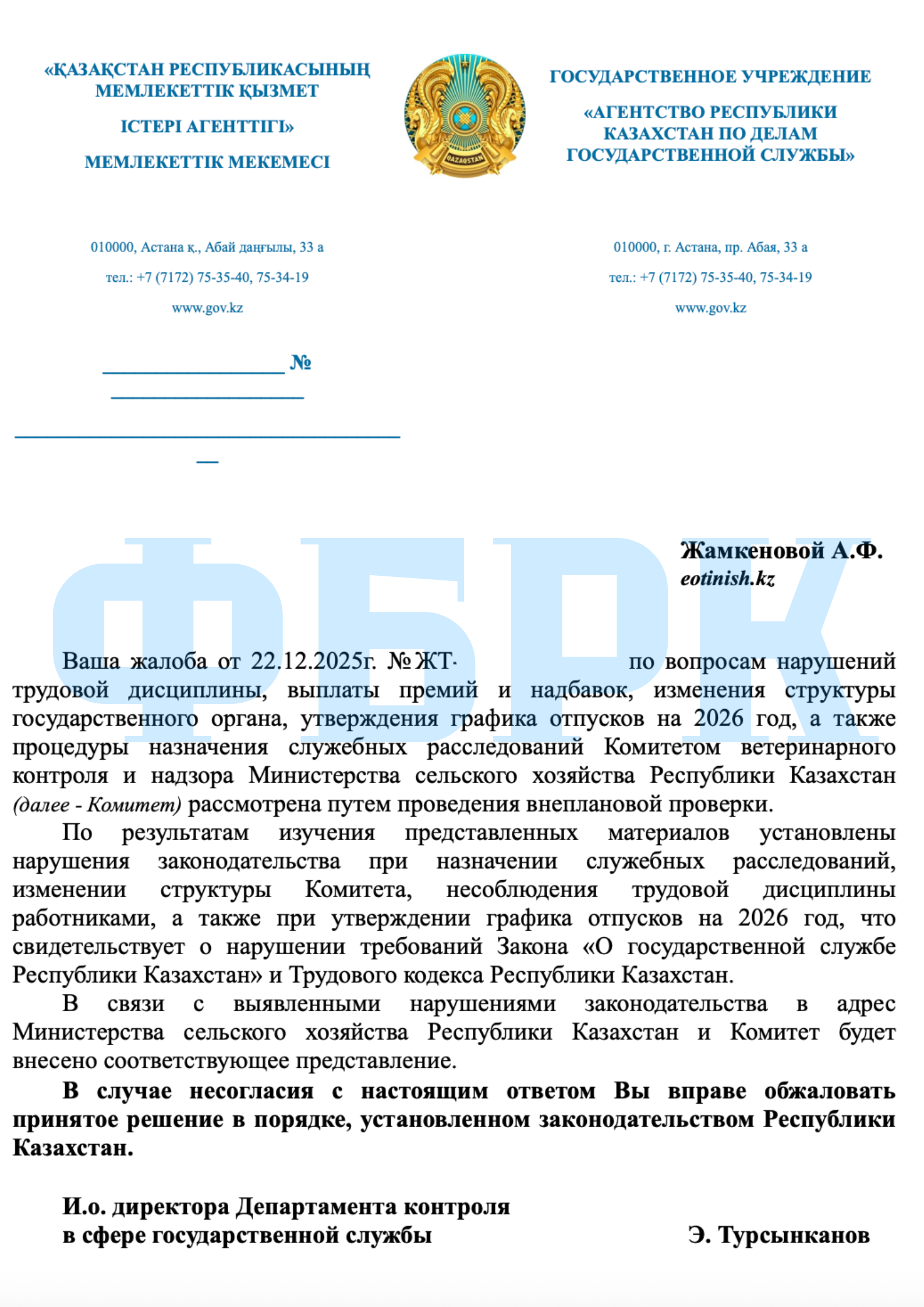 Агентство по делам государственной службы официально подтвердило нарушения законодательства в комитете ветеринарного контроля и надзора министерства сельского хозяйства (КВКН МСХ). Об этом говорится в официальном ответе на жалобу Альфии Жамкеновой, руководителя управления кадровой и организационной работы комитета.