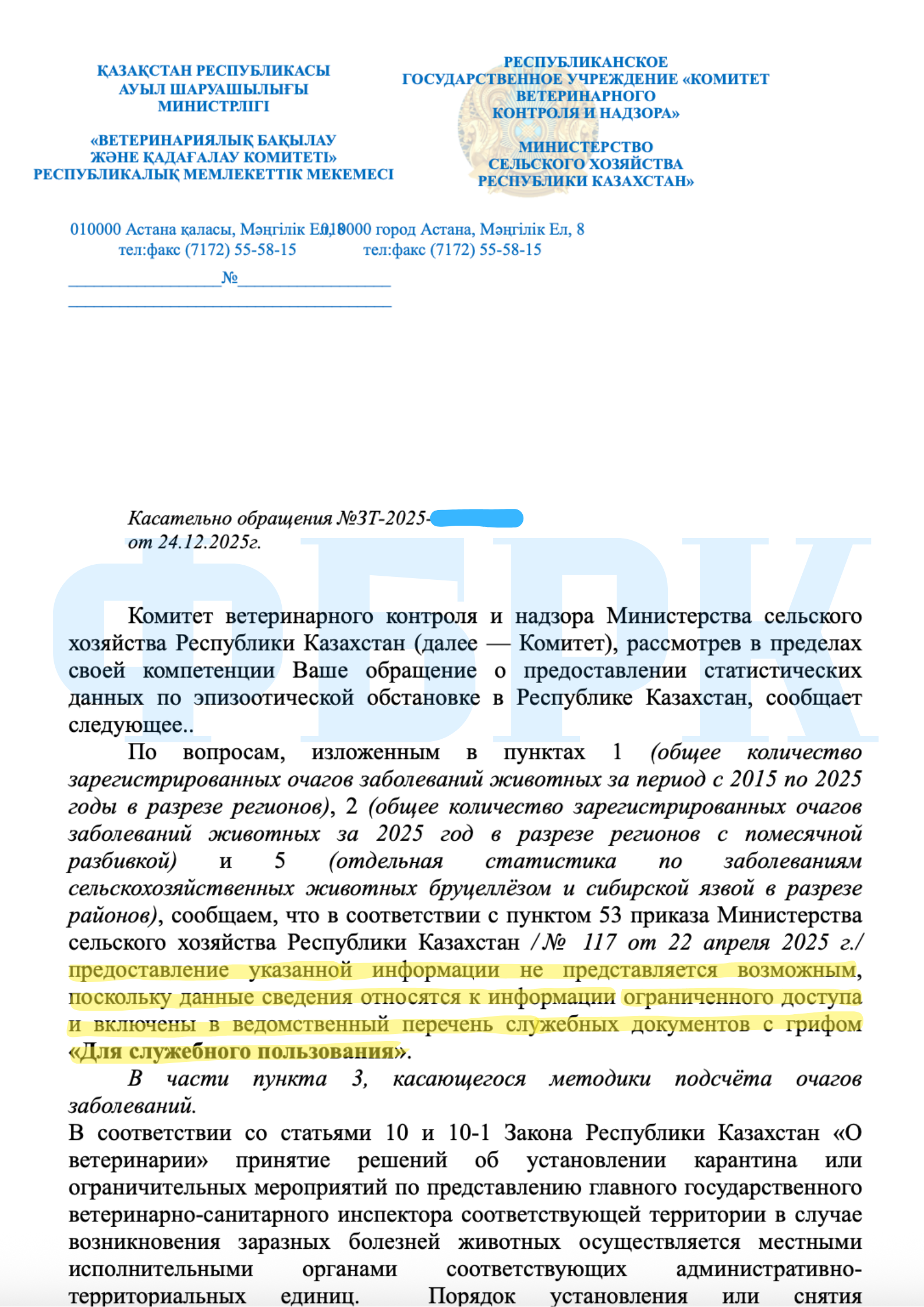 Комитет ветеринарного контроля и надзора (КВКиН) министерства сельского хозяйства (МСХ) отказал редакции ФБРК в предоставлении статистики по очагам заболеваний животных, сославшись на гриф «Для служебного пользования». Однако, как оказалось, аналогичные эпизоотические данные свободно публикуются в международных научных журналах казахстанскими учёными. Так в чем же дело?