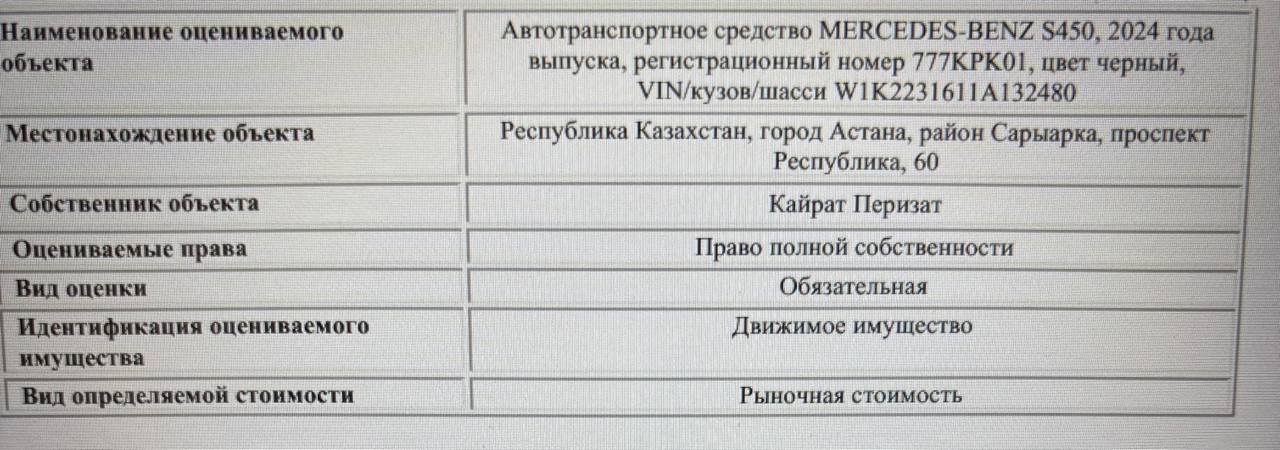 По данным Telegram-канала Nege.Aqsha, департамент государственного имущества и приватизации Астаны выставил автомобиль Mercedes-Benz S450 с государственным номером 777KPK01. В комплекте с машиной передаётся ключ с установленной сигнализацией Pandora.