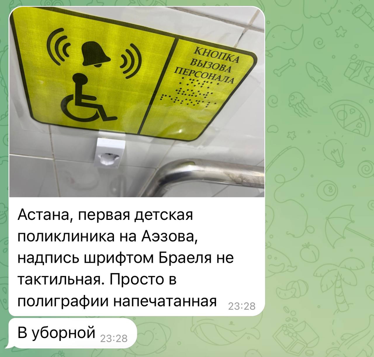 По данным Telegram-канала «НЕХабар», табличка размещена в уборной медицинского учреждения — городской поликлиники №1 в Астане, расположенного по адресу: ул. Мухтара Ауэзова, 24. На ней размещена кнопка вызова персонала и текст, продублированный шрифтом Брайля.