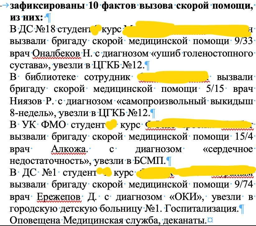 В частности, в документе за 19 января указаны имя студентки и информация о её состоянии — «доставлена с запахом алкоголя». В другом случае зафиксирован вызов скорой помощи с диагнозом «маточное кровотечение» с указанием курса, факультета и имени.