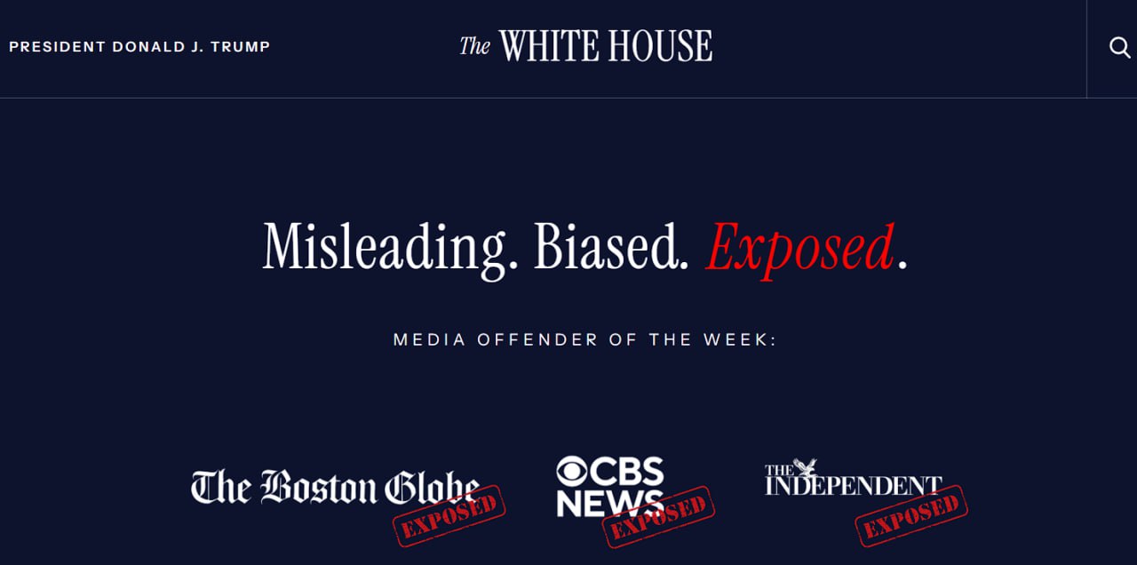 На сайте разместили рубрику «Медиа-преступник недели», в которую на этот раз вошли Boston Globe, CBS News и Independent. Претензии связаны с освещением конфликта вокруг шести законодателей-демократов, которые опубликовали видео с призывом к военнослужащим не выполнять незаконные приказы. Трамп в ответ обвинил их в «подстрекательстве к мятежу, караемом смертной казнью», и сделал репост заявления со словами: «Повесить их».