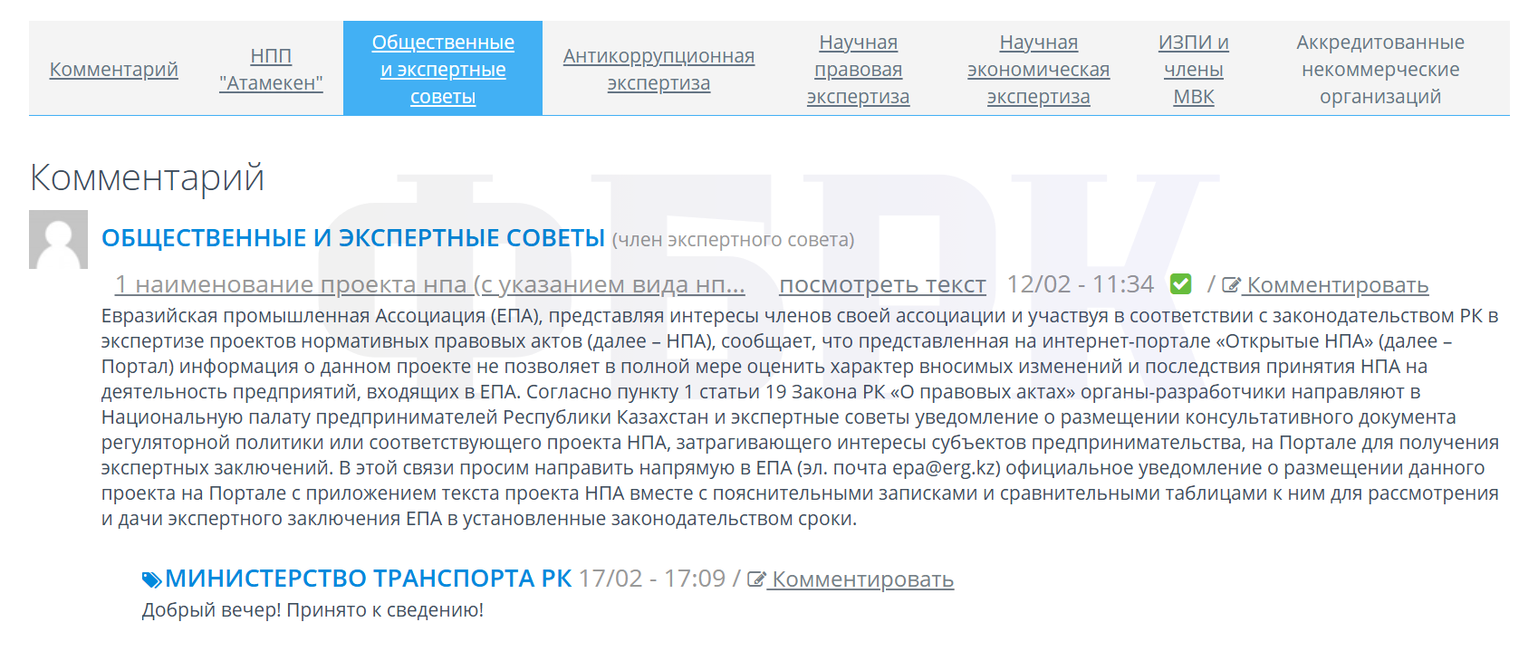 В разделе «Общественные и экспертные советы» на портале опубликован комментарий от имени Евразийской промышленной ассоциации (ЕПА). В нём указывается на невозможность полноценной оценки проекта в связи с отсутствием текста документа, сравнительной таблицы и финансовых расчётов.