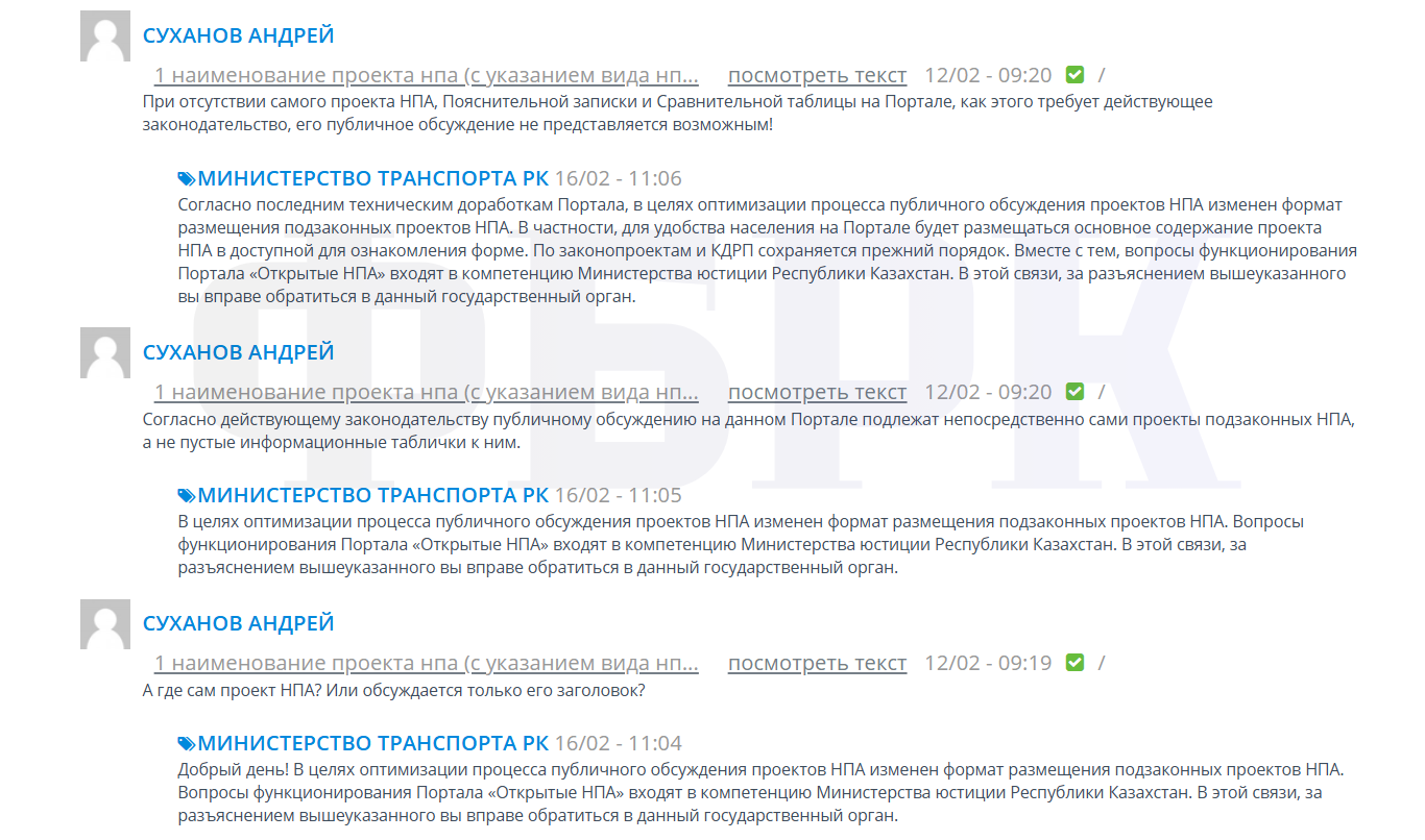 В ответ на замечания пользователей представители министерства транспорта указали, что формат размещения материалов на портале был изменён. Ведомство отметило, что вопросы функционирования портала относятся к компетенции министерства юстиции.
