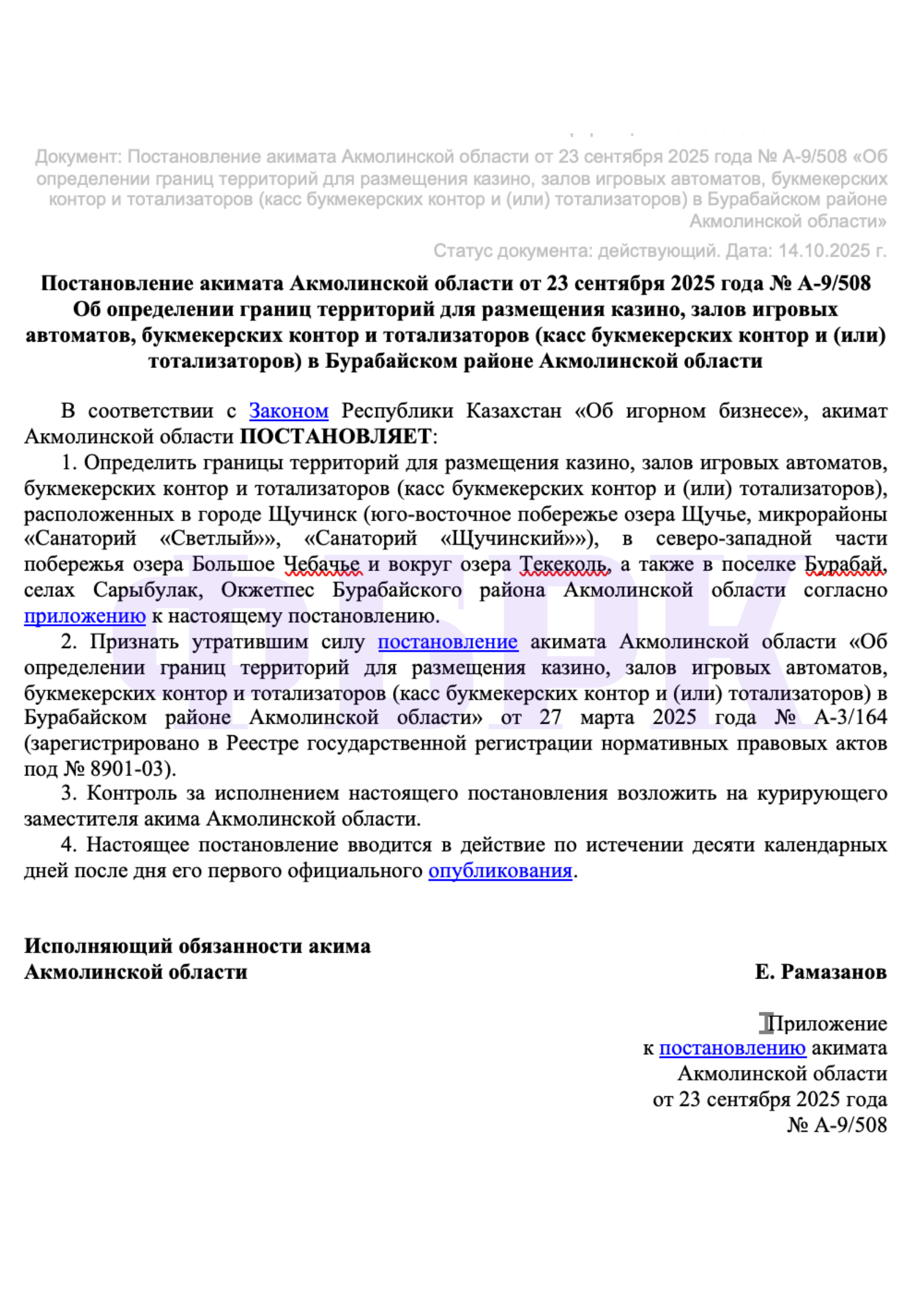 И вот здесь появляется интересная деталь, которая заставляет по-новому взглянуть на происходящее. В наш анонимный бот попало постановление акимата Акмолинской области от 23 сентября 2025 года. Документ определяет границы территорий для размещения казино, залов игровых автоматов, букмекерских контор и тотализаторов в Бурабайском районе. Причем зоны эти охватывают именно те места, где сейчас идет изъятие земель: город Щучинск с его санаториями «Светлый» и «Щучинский», северо-западная часть озера Большое Чебачье, окрестности озера Текеколь, поселок Бурабай, села Сарыбулак и Окжетпес.