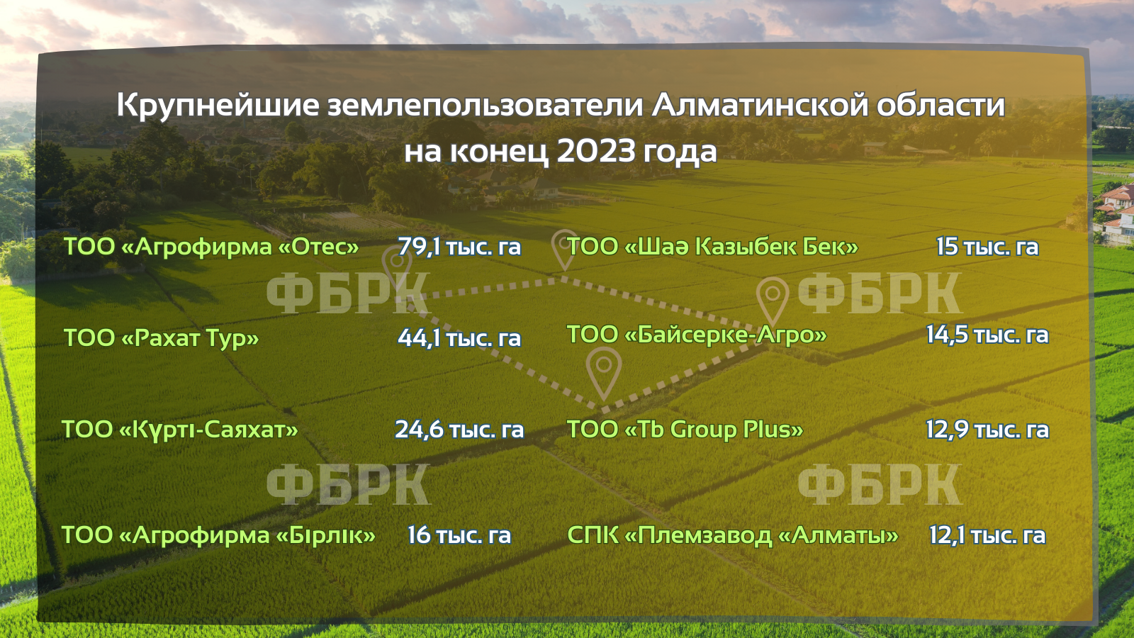 Алматинский филиал НАО «ГК «Правительство для граждан» собрал информацию по собственникам крупнейших земельных участков, что, по нашему мнению, не совсем корректно, т.к. общая площадь владений латифундистов может складываться и из площадей нескольких, не самых крупных участков.
