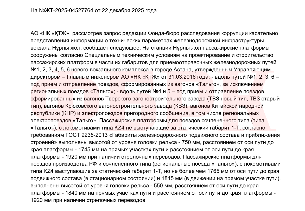 Согласно ответу от 22 декабря, платформы на станции Нұрлы жол построены по специальным техническим условиям, утвержденным 31 марта 2016 года. Для междугородних поездов Talgo (пути №1, 2, 3, 6) расстояние от оси пути до края платформы составляет 1745 мм на прямых участках. Для поездов российского производства, пригородных электропоездов и региональных поездов Talgo (предположительно, электропоезда пригородного сообщения — прим. ред. ФБРК) на путях №4 и 5 это расстояние увеличено до 1840 мм.