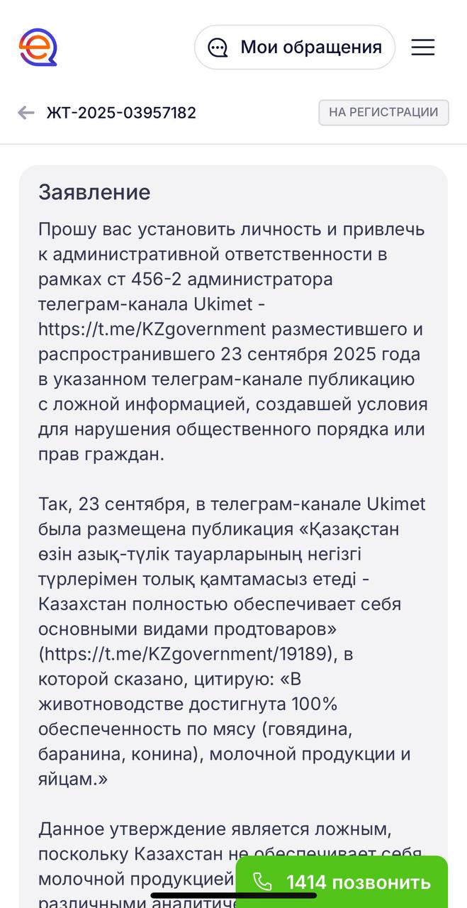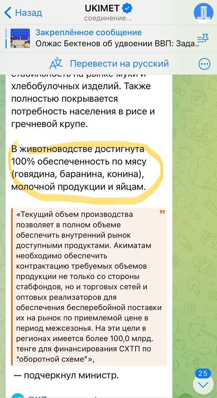 Он отметил, что 23 сентября на канале Ukimet была опубликована публикация под заголовком: «Қазақстан өзін азық-түлік тауарларының негізгі түрлерімен толық қамтамасыз етеді — Казахстан полностью обеспечивает себя основными видами продтоваров».