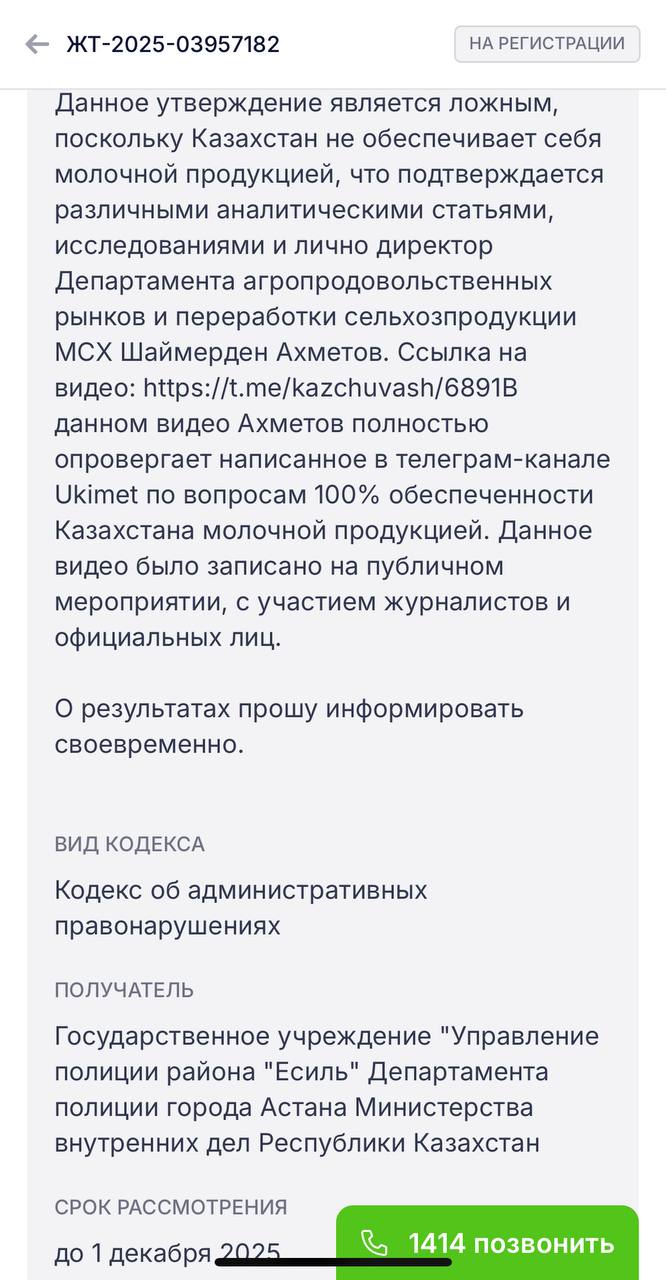 В заявлении, направленном в управление полиции района Есиль департамента полиции Астаны, Павлов просит установить личность администратора канала и привлечь его к административной ответственности по ст.456-2 КоАП РК («Размещение, распространение ложной информации»).