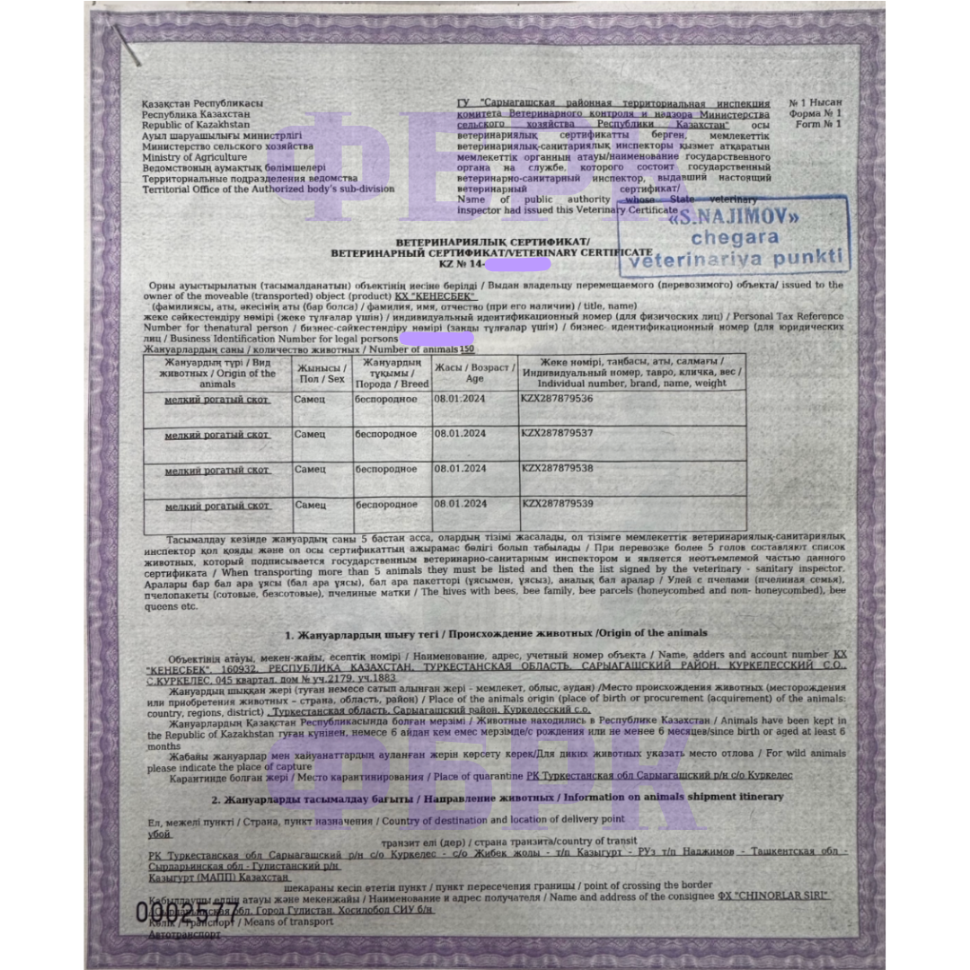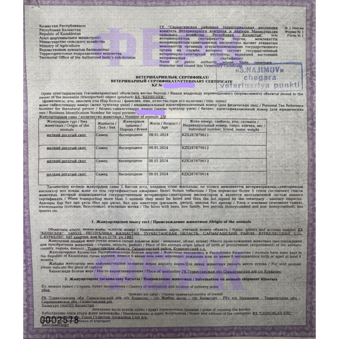 Например, в ветеринарном сертификате, выданном крестьянскому хозяйству (КХ) «Кенесбек», указано количество животных - 170 голов. В приложенной таблице же перечислено всего 4 животных с индивидуальными номерами. В другом сертификате для той же компании прописано 150 голов, в списке — снова 4 животных с индивидуальными номерами (без полного списка перевозимых животных).