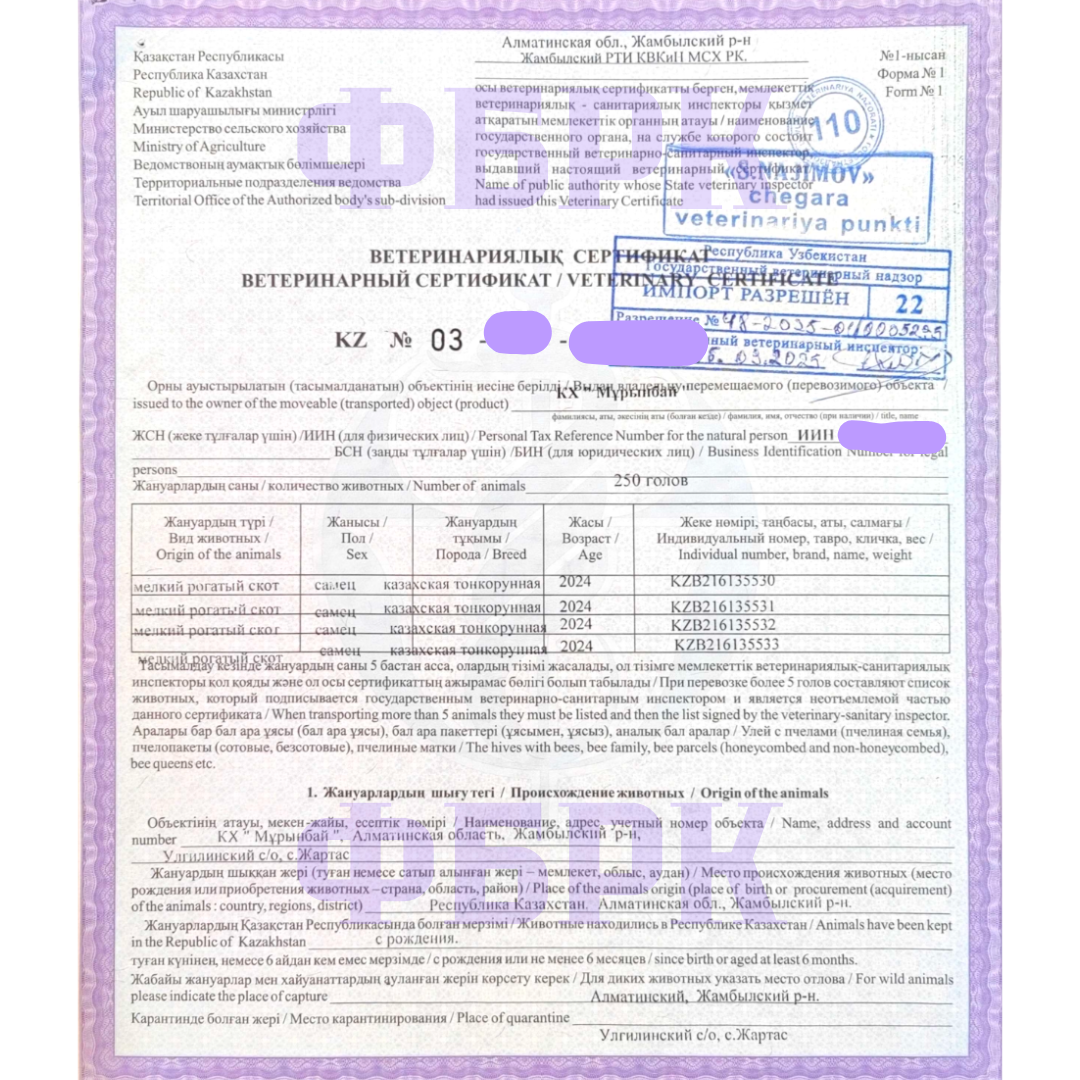 Два сертификата, выданных КХ «Мурынбай», содержат идентичное заявленное количество — 250 голов. В обоих случаях в отдельных списках с индивидуальными номерами указано по 172 животных. Аналогичная картина наблюдается и в документах остальных компаний.