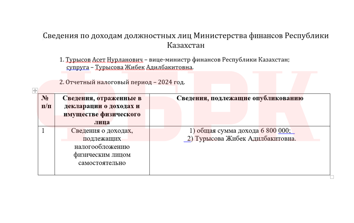 Так, согласно данным министерства финансов Республики Казахстан, супруга вице-министра финансов Асета Турысова —Жибек Турысова — задекларировала доход в размере 6,8 млн тенге. Иные источники или структура дохода в опубликованных материалах не уточняются.