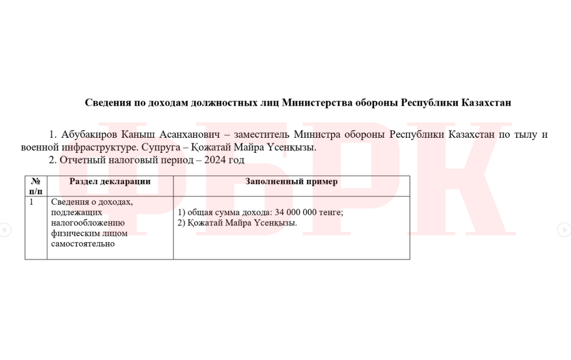Согласно сведениям министерства обороны, супруга заместителя министра обороны по тылу и военной инфраструктуре Каныша Абубакирова —Майра Кожатай — получила доход в размере 34 млн тенге за 2024 год.