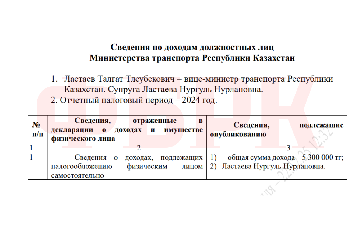В министерстве транспорта супруга вице-министра Талгата Ластаева —Нургуль Ластаева — задекларировала доход в размере 5,3 млн тенге за отчетный год.