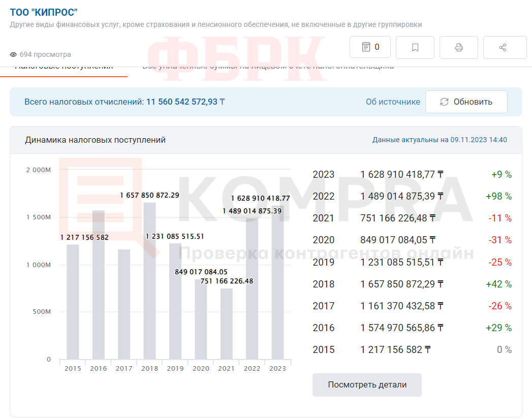 Согласно налоговым поступлениям на сегодняшний день, в 2023 году ТОО «Кипрос» уже оплатило порядка 1,6 млрд тенге, в то время как по итогам 2022 года сумма выплаченных налогов составляла 1,5 млрд тенге, а в 2021 и 2020 годах – 751 млн тенге и 849 млн тенге соответственно.
