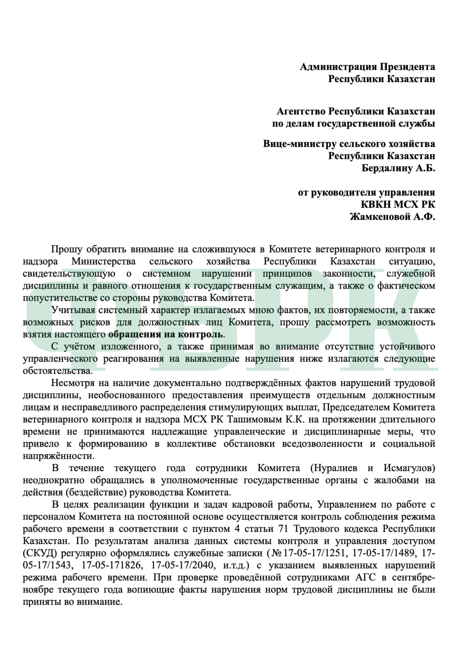 Конфликт в комитете ветеринарного контроля и надзора министерства сельского хозяйства (КВКН МСХ) вышел за пределы обычных служебных разногласий. Руководитель управления кадровой и организационной работы, уполномоченная по этике комитета Альфия Жамкенова направила обращение вице-министру Амангалию Бердалину с просьбой взять ситуацию на контроль и провести служебную проверку действий председателя комитета Казбека Ташимова.