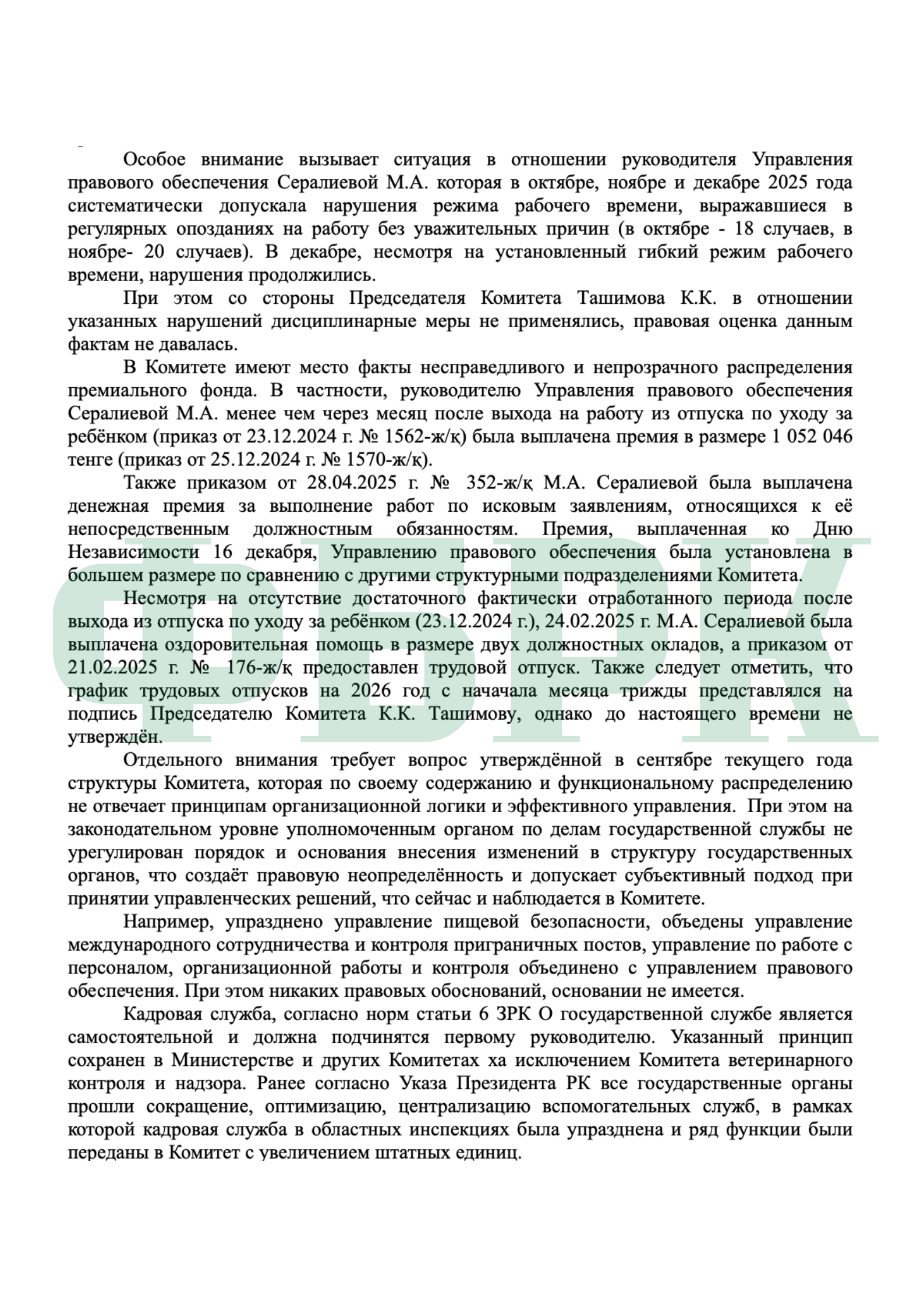 Руководитель управления правового обеспечения г-жа Сералиева в октябре 2025 года допустила 18 опозданий, в ноябре — 20. По версии автора обращения, дисциплинарных мер не последовало. И даже проверка Агентства по делам государственной службы в сентябре-ноябре 2025 года эти факты не учла.