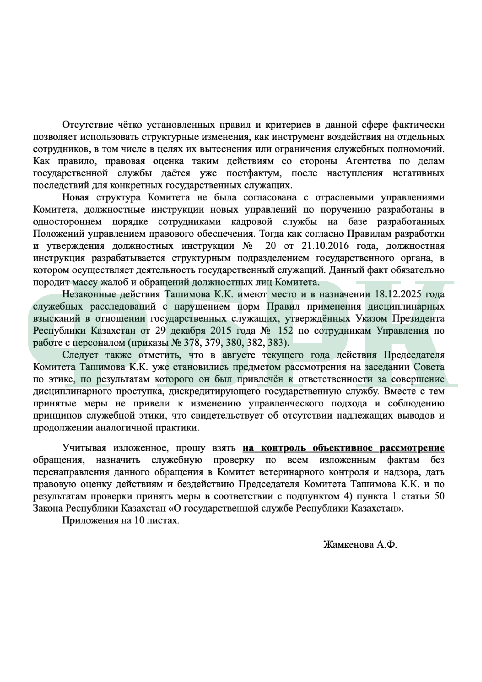 18 декабря 2025 года Казбек Ташимов назначил служебные расследования в отношении пяти сотрудников управления по работе с персоналом. Автор обращения считает это нарушением правил применения дисциплинарных взысканий.