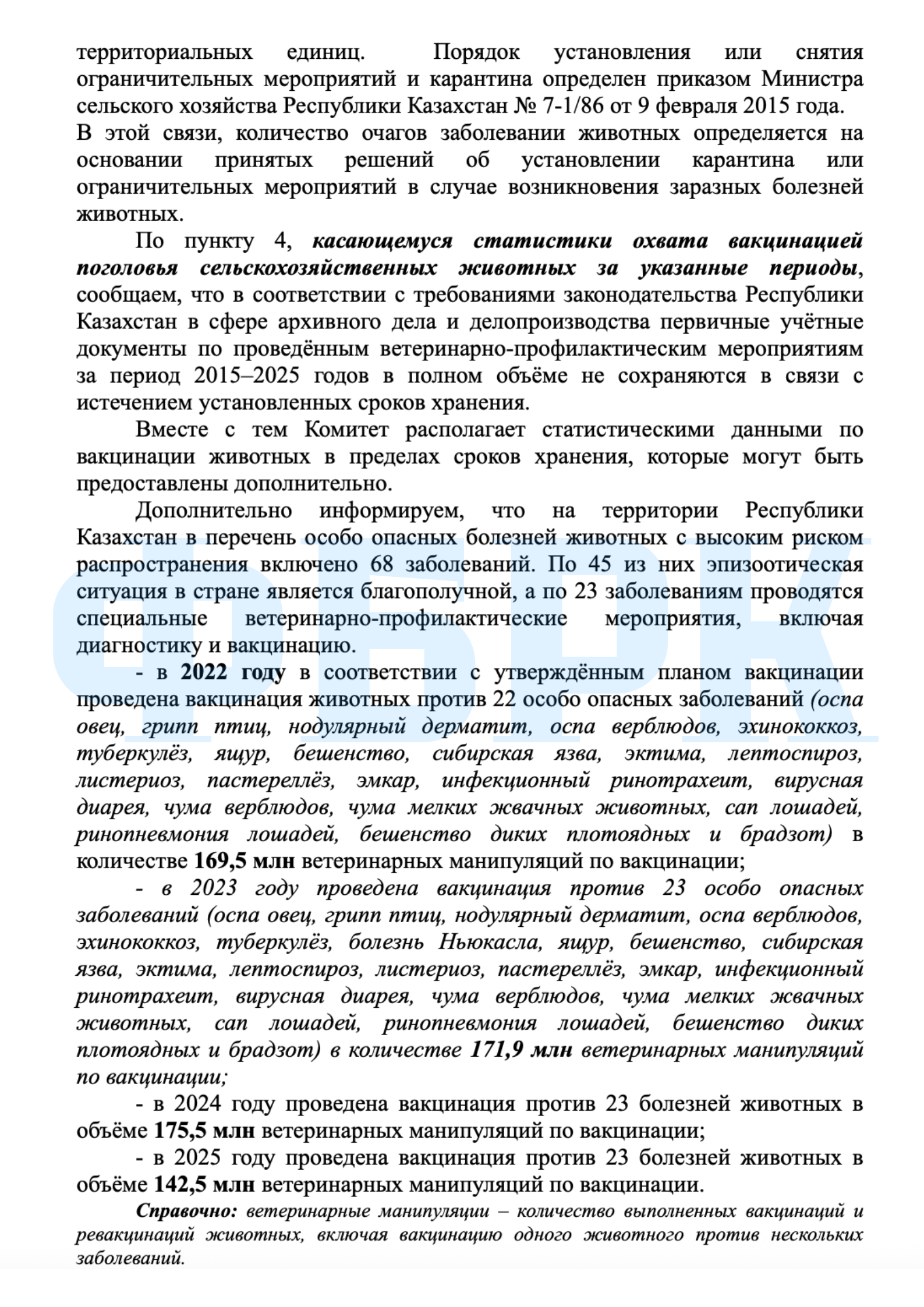 По четвёртому пункту запроса — о статистике охвата вакцинацией — КВКиН сообщил, что «первичные учётные документы по проведённым ветеринарно-профилактическим мероприятиям за период 2015-2025 годов в полном объёме не сохраняются в связи с истечением установленных сроков хранения».