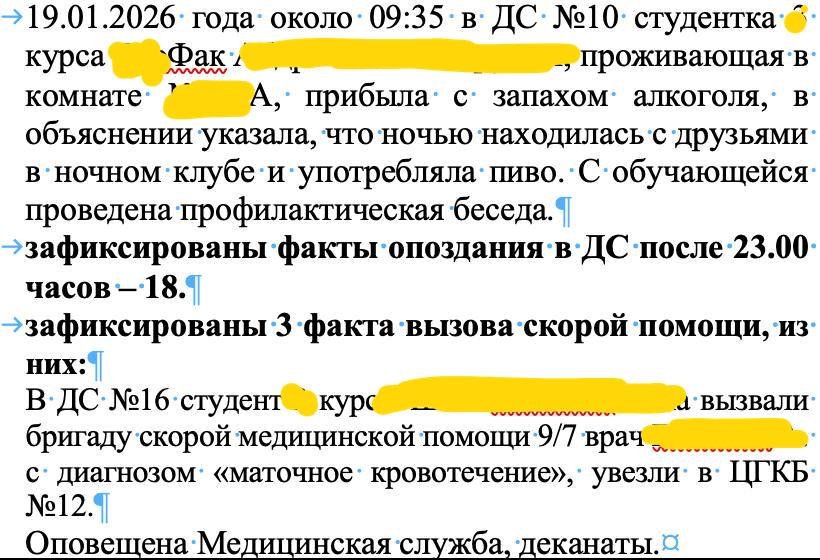 В частности, в документе за 19 января указаны имя студентки и информация о её состоянии — «доставлена с запахом алкоголя». В другом случае зафиксирован вызов скорой помощи с диагнозом «маточное кровотечение» с указанием курса, факультета и имени.